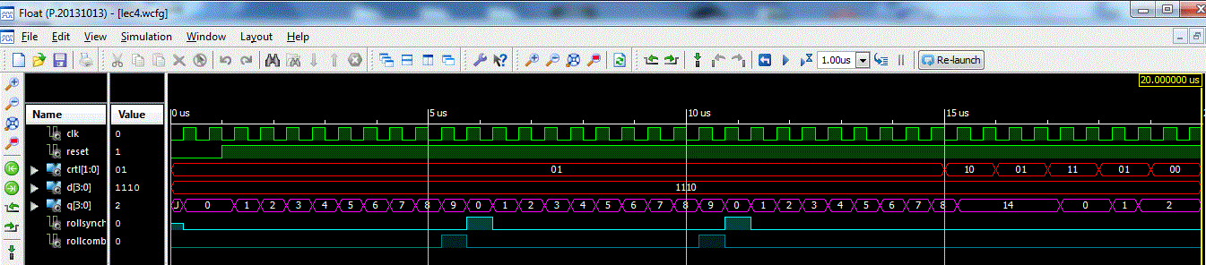 First, we will fill out the timing diagram on the first page of hand04.docx (linked above). The key idea to remember is that the output of the counter does not change until a positive edge of the clock arrives. On the first 2 rising clock edges, reset is equal to 0 so Q will go to 0. After the second rising clock edge, though, the reset line is never low, so the behavior of the counter is dictated by the last four rows of the state table. On clock edges 3 to 30, ctrl is 01, so Q is incremented by 1. Remember that on the clock edge after Q=9, Q rolls back to 0. The following timing diagram was created in Isim to recreate the timing diagram in the handout.