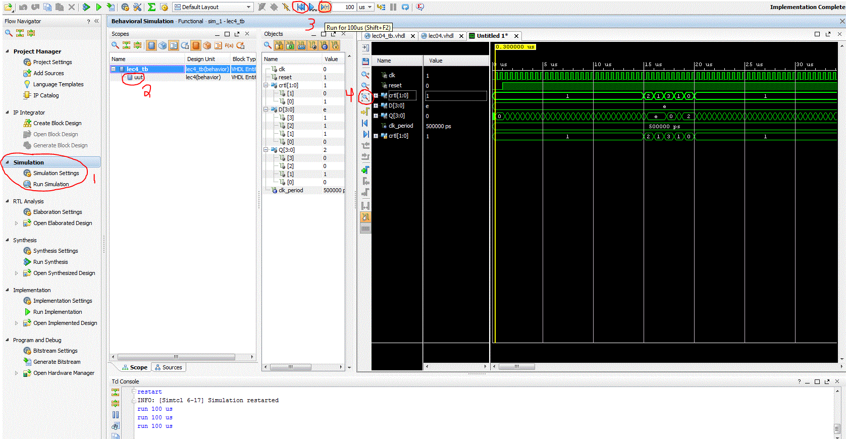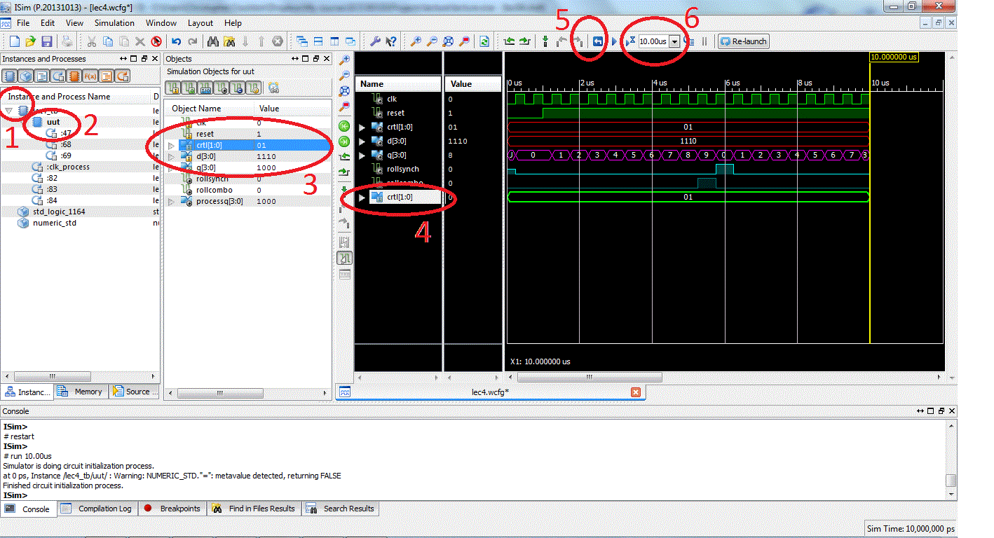 In order to fully understand the behavior of the counter being instantiated inside the testbench, it is sometimes necessary to transcend the design hierarchy and examine signals inside modules not directly visible at the top layer. As an example, let's say you wanted to monitor the control signal into the lab4 counter while running the testbench. This is accomplished in ISim (which has the same functionality as Vivado Simulator) using the following four steps (illustrated in the figure below).
