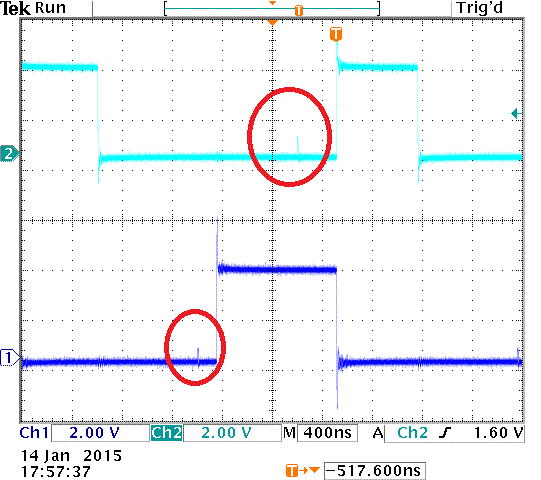 At first glance, you would not be faulted for thinking that these two circuits have identical outputs. Theoretically, they do, but reality has a cruel surprise in the the form of glitches. If you connect an oscilloscope up to the PMOD connector (see page 20 of the Nexys Video Board Reference Manual) corresponding to pins JB(3) and JB(2) (the most 2 significant bits of the non-gated comparator outputs), you would see the trace below.