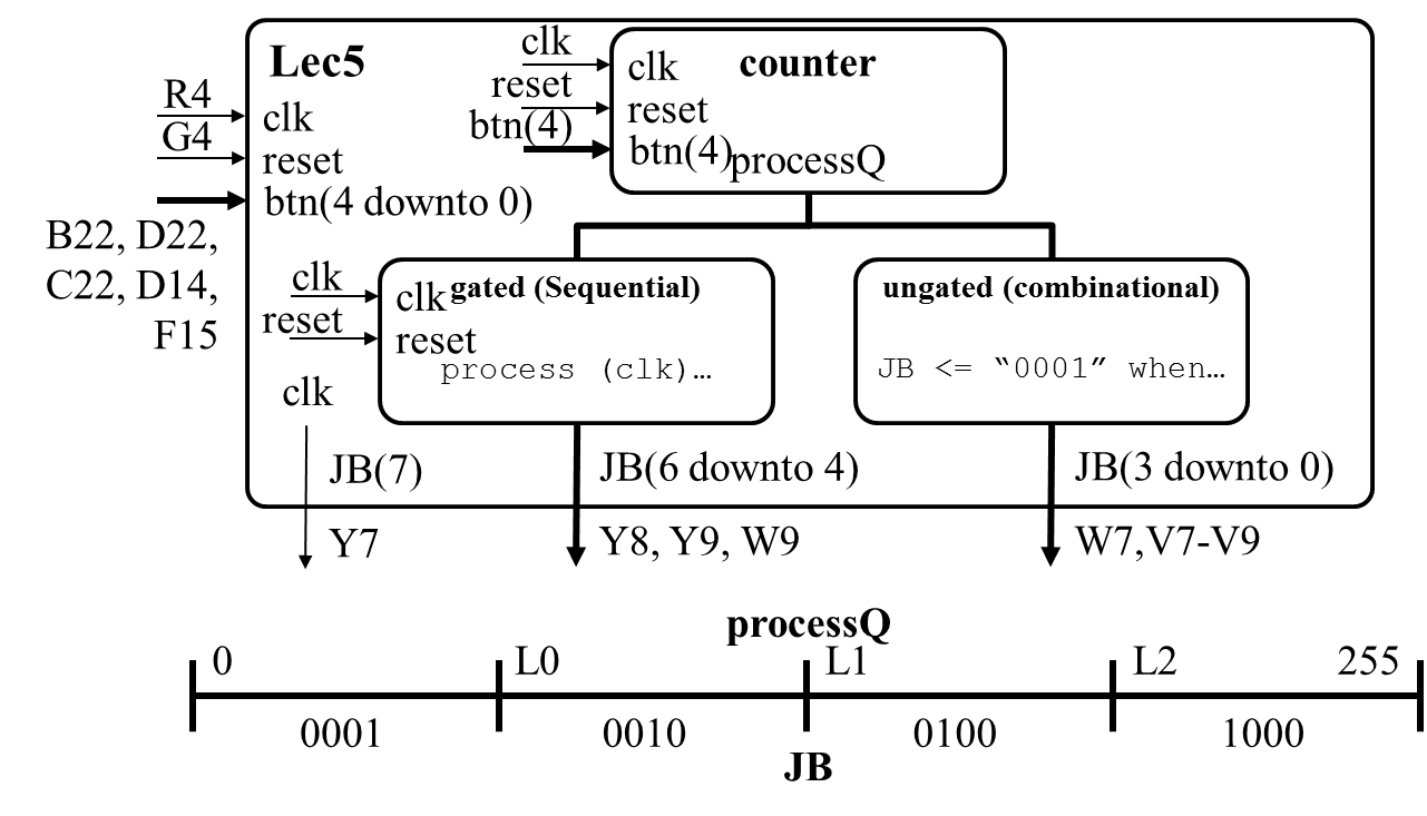 The outputs from the two processing blocks depend on the value of the counter's output (processQ) compared to one of three constants: L0, L1, L2 (set inside lec05.vhdl). Both the gated and non-gate circuit have the same relationship between processQ and their output JB - the difference is how this output is generated. The table below illustrates.