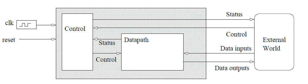 A digital system built using the datapath and control design approach is still a digital system whose inputs and outputs can be categorized into Data Input, Data Output, Control and Status. The digital system shown below consists of two components, a datapath and a control unit.