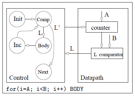The control unit sequences the actions of the hardware in the datapath. The execution of the for loop begins with an initialization of the counter in the Init state. In this state, the control unit asserts a load signal on the control lines to the counter causing the counter to be initialized to A. On the next clock edge, the counter loads A and the control unit transitions to the Comp state. In this state, the control unit does nothing, giving the comparator time to determine the relative magnitude of i and B, and to assert its L output to the control unit in the form of a status signal. The control unit uses the status signal to either execute the body of the for loop, or to exit the for loop and proceed with the next instruction after the for loop. The Body state represents the collection of states derived by parsing all the statements in the body of the for loop. At the end of the for loop's body, the control unit enters the Inc state where the control unit asserts an increment signal on the control lines to the counter. This assertion causes the counter to count up on the next edge which also causes the control unit to transition back to the Comp state.