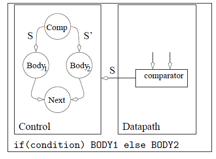 When an if/then/else statement is encountered in a program, BODY_1 is executed when the condition is true. If condition is false, then BODY_2 is executed. BODY_1 and BODY_2 contain 0 or more statements. Typically, the datapath computes the condition using a comparator. In such a case, the datapath requires a comparator, the output of which is the status signal shown in Figure 11.1.