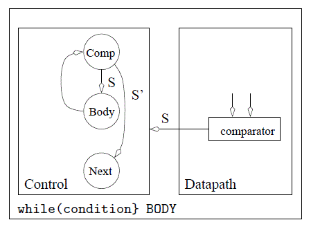 When a while loop is encountered in a program, Body is executed while the condition is true. Typically, the datapath computes the condition using a comparator, the output of which is the status signal shown in Figure 11.3. While the control unit is in state Comp, the condition is being evaluated, the status signal is being communicated to the control unit, and the control unit deciding on whether to transition to either the Body or Next states. The Body state represents the collection of states derived by parsing all the statements in the body of the while loop.