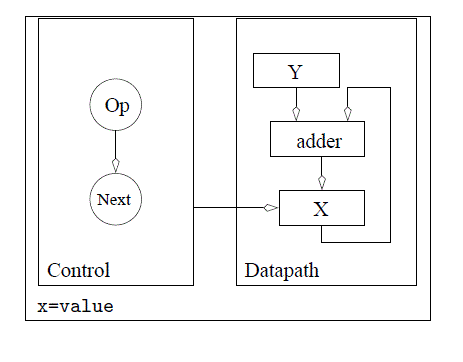 When an assignment statement is encountered in a program, X is assigned a new value. This statement is realized by placing a register in the datapath whose input is the value on the right-hand side of the assignment statement. In order to make the assignment, the control unit enters the Op state, where it asserts a load signal on the registers control input. On the next positive edge of the clock, the register loads its value and the control unit moves on to the Next state. The size of the register storing X is determined by the range of values required to be stored in X. In some cases, this size is defined by the word statement; in other cases, the designer must make a judgment call on a reasonable value range.