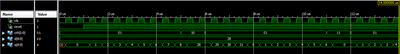In this case, I made a 5-bit counter. The testbench linked above runs the counter through all four control modes and even shows how it rolls over (around 7.5uS). A picture of the run of the testbench can be seen below.