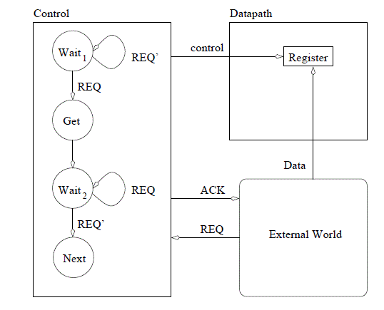 unit waits. As soon as REQ=1, the control unit proceeds to state Get where