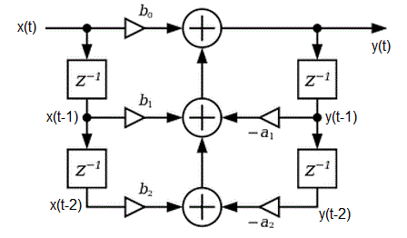 output y(t) = x(t)*b0 + x(t-1)*b1 + x(t-2)*b2 - y(t-1)*a1 - y(t-2)*a2