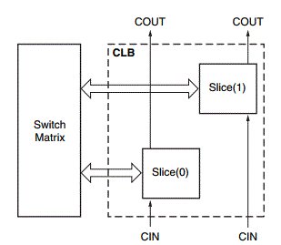 each CLB contains two Logic Slices (discussed in the following section). The logical layout of a CLB can be seen in the Figure below.