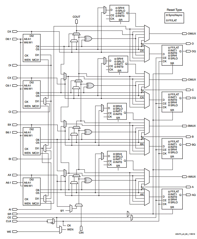 In the diagram above, three major SLICEM subystems can be seen: 1. the four 6-input LUTs, 2. the eight flip-flops, and 3. the fast carry logic.